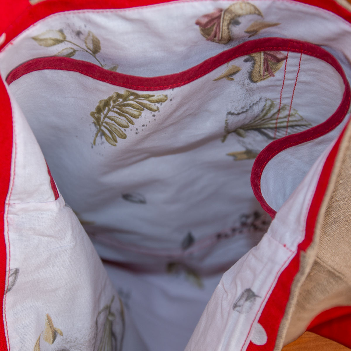 Unikalna torba uszyta z naturalnego lnu pochodzącego z autentycznych wojskowych worków z lat 60 w połączeniu z tkaniną bawełnianą. Wyjątkowy materiał z historią łączy klasyczny beż z wyrazistym, czerwonym akcentem w groszki. Lekka, pojemna i wygodna w codziennym użytkowaniu. Torba posiada jedną zewnętrzną kieszonkę, podszewkę w piękny wzór angielskich gąsek oraz dwie pojemne kieszonki w środku. Torba nie posiada zapięcia. Prezentowany model dostępny jest od ręki w wymiarze 37x37 cm. Torbę można zamówić podobny model w innym rozmiarze i kolorze.